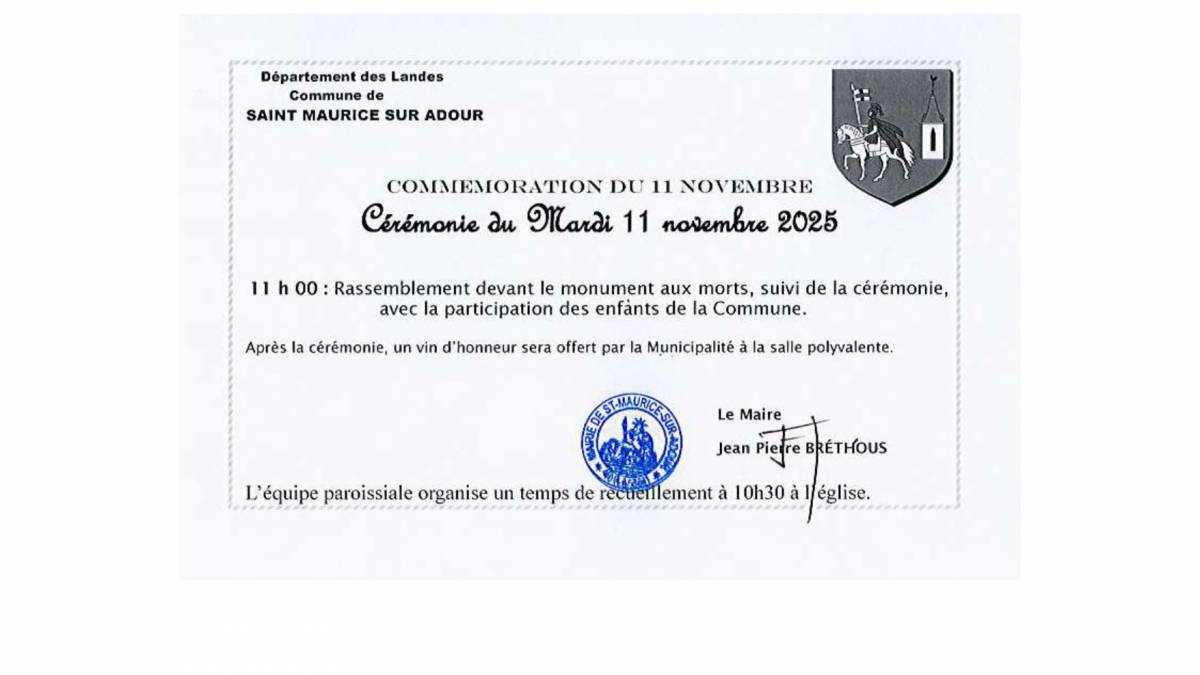 Venez participer à la commémoration du mardi 11 novembre 2025 à 11h devant le monument aux morts, après la cérémonie un vin d'honneur sera offert par la municipalité à la salle polyvalente. L'équipe paroissiale organise un temps de recueillement à 10h30 à l'église.