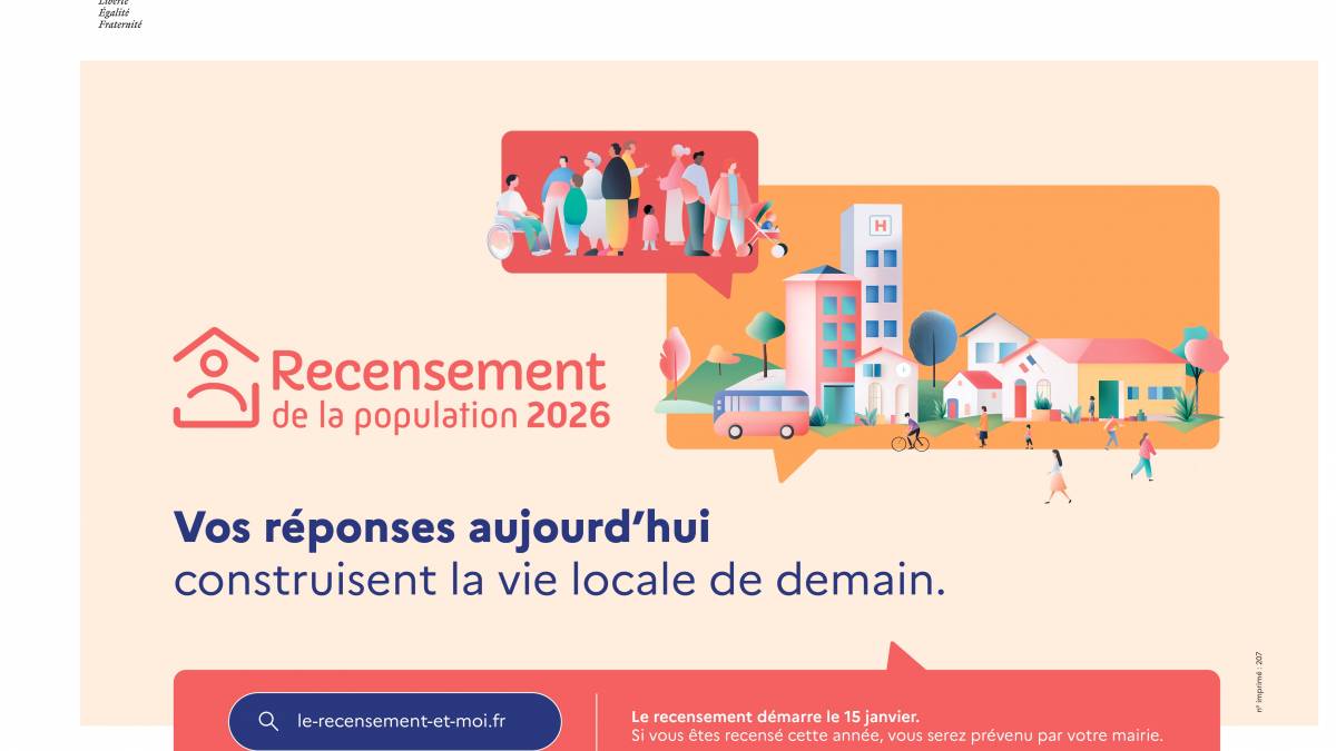 Merci de prendre connaissance du recensement citoyen qui se tiendra sur votre commune du jeudi 15 janvier 2026 au samedi 14 février 2026 et d'offrir le meilleur accueil à l'agent recenseur qui se présentera à votre domicile.